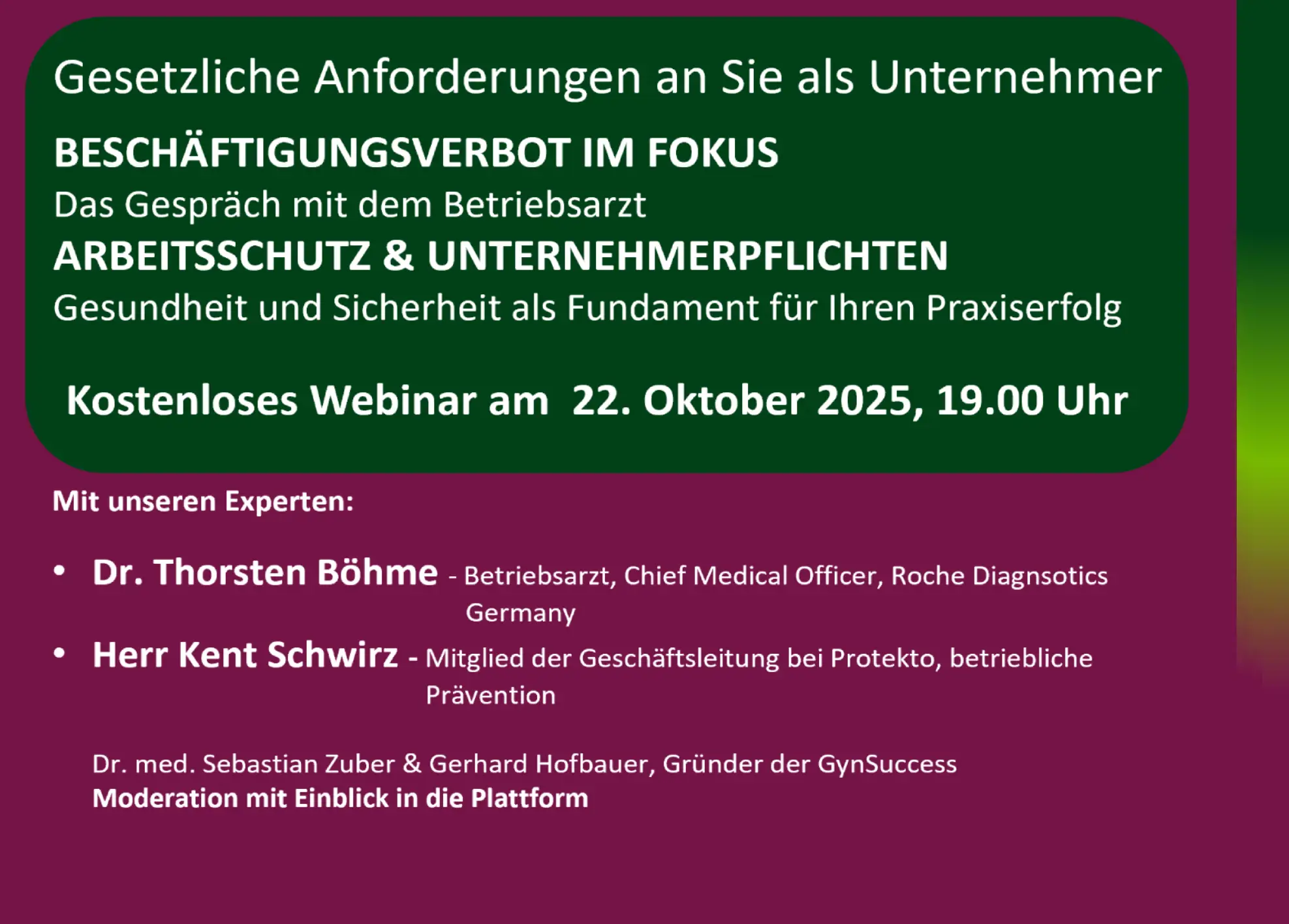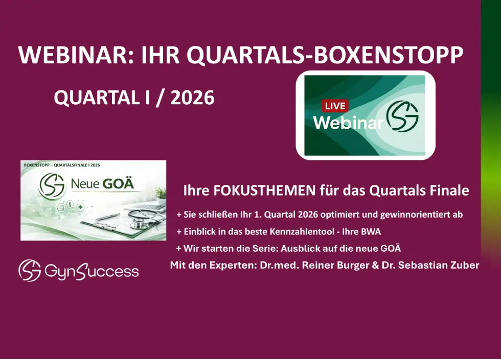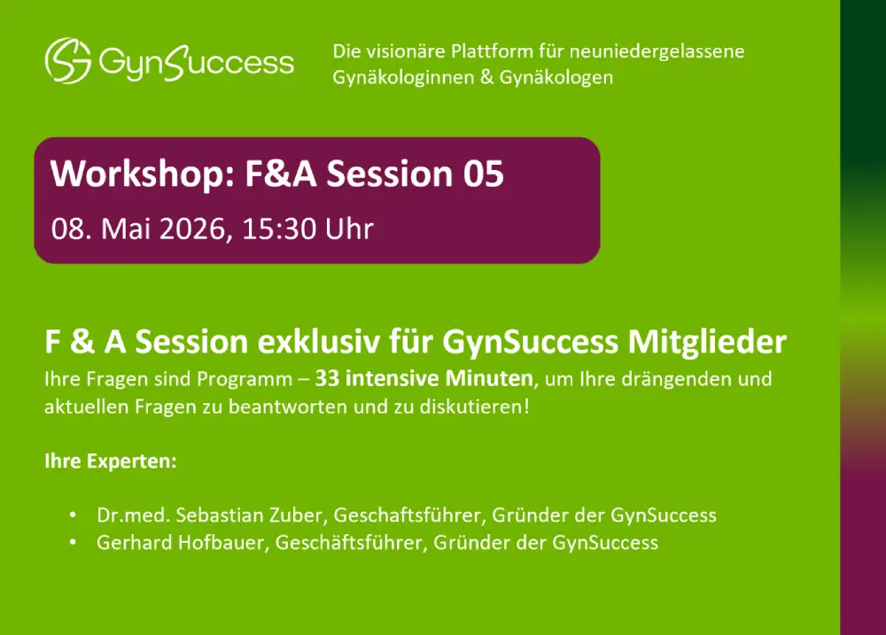 Im Sommer 2024 haben wir GynSuccess ins Leben gerufen. Dr. med. Sebastian Zuber, ein erfahrener Gynäkologe und renommierter Referent für Neuniederlassungsseminare, sowie Gerhard Hofbauer, der auf über 30 Jahre Wirken im pharmazeutischen Vertrieb zurückblickt und zahlreiche Frauenarztpraxen begleitet hat, bilden das Fundament von GynSuccess.